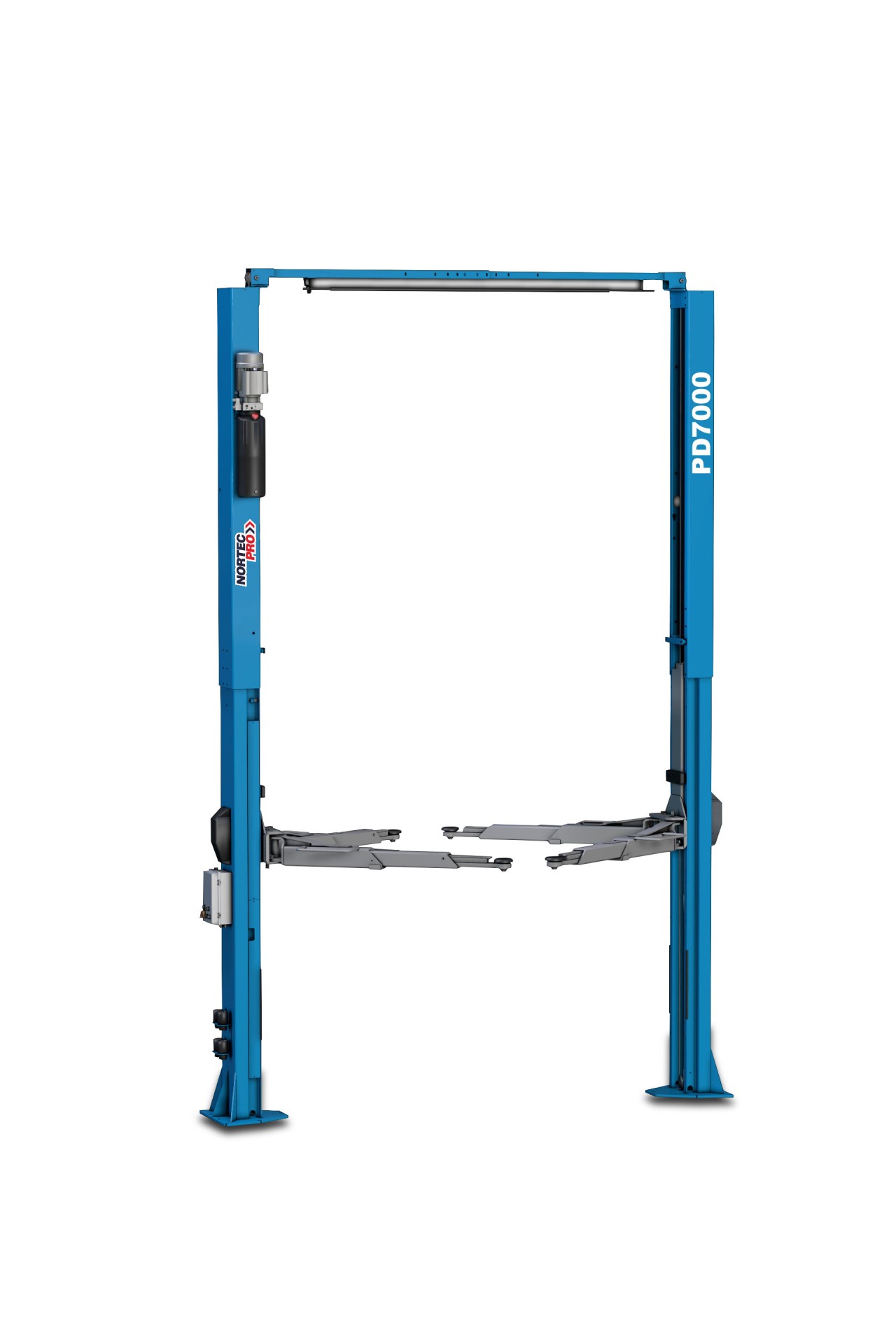 Podnośnik dwukolumnowy PD7000 to potężna maszyna klasy premium – podnośnik elektrohydrauliczny o gigantycznym udźwigu 7T (7000 kg), zasilany przemysłowym napięciem 400V. Zaprojektowano go z myślą o najcięższych wyzwaniach w autoryzowanych serwisach i wyspecjalizowanych warsztatach zajmujących się obsługą największych pojazdów. Dzięki budowie łączonej górą (tzw. clear floor) całkowicie zrezygnowano z dolnego progu przejazdowego, gwarantując idealnie płaską posadzkę między kolumnami. Unikalną cechą tego modelu, obok potężnej siły nośnej, jest regulowany górny trawers, który umożliwia dostosowanie całkowitej wysokości podnośnika w aż czterech zakresach: od 4976 mm, przez 5128 i 5280 mm, aż do maksymalnie 5432 mm. Za bezpieczne i płynne wznoszenie odpowiada precyzyjna mechaniczna synchronizacja linowa. Podnośnik 7000 kg wyposażono w zautomatyzowaną elektromagnetyczną blokadę wysokości, sterowaną bezpośrednio z pulpitu, oraz automatyczną blokadę ramion, która natychmiastowo chroni je przed niepożądanym przesunięciem pod obciążeniem. Dodatkowym atutem są fabrycznie zamontowane maty gumowe zabezpieczające drzwi przed otarciem.