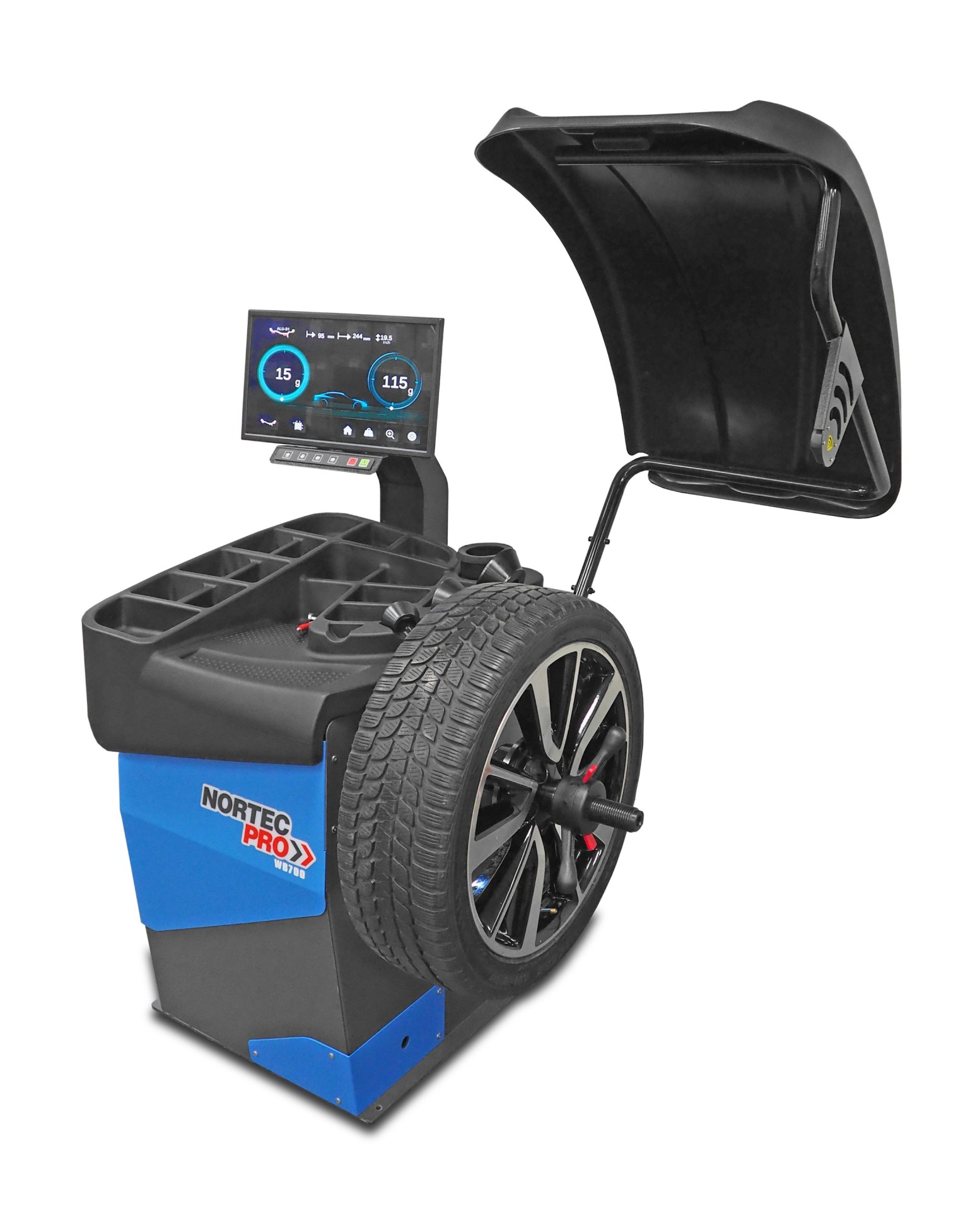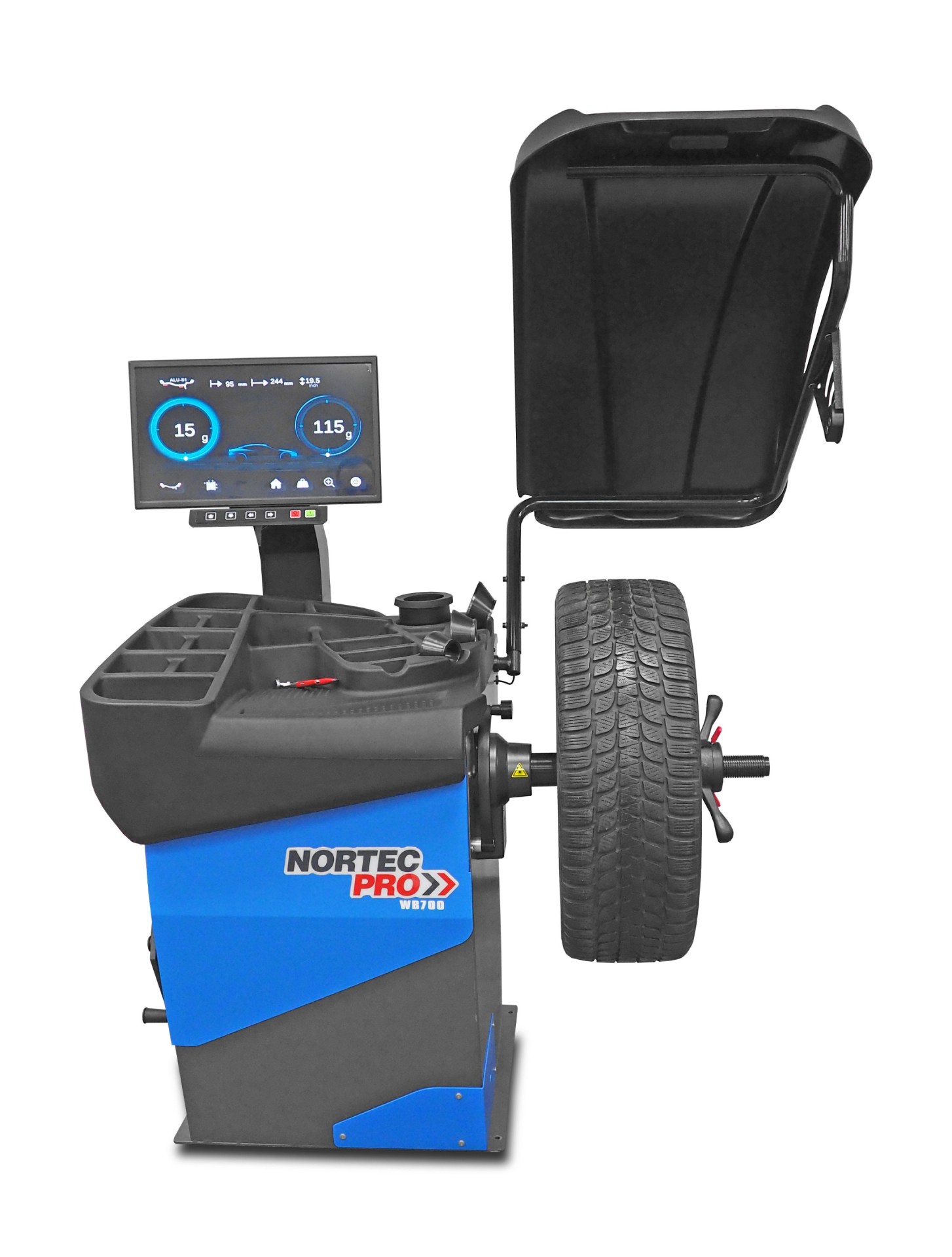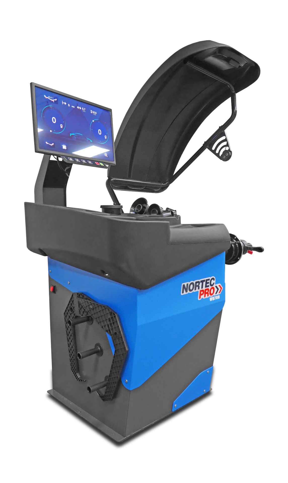 Wyważarka WB700 to flagowy, w pełni zautomatyzowany model wyważarki komputerowej, zaprojektowany do profesjonalnej obsługi kół samochodów osobowych i lekkich dostawczych. Urządzenie zasilane prądem 230V z silnikiem o mocy 370W zapewnia najwyższy standard pracy dzięki potrójnemu systemowi automatycznego wprowadzania danych. Odległość koła oraz jego średnica odczytywane są samoczynnie przez wysuwaną miarkę, a pomiar szerokości realizuje wbudowany sonar, co drastycznie skraca czas przygotowania pomiaru. Użytkowanie ułatwia innowacyjny system automatycznego pozycjonowania, który natychmiast po teście samoczynnie zatrzymuje i ustawia koło dokładnie w miejscu niewyważenia. Maszyna posiada precyzyjny wskaźnik laserowy liniowy wspierany przez zintegrowane oświetlenie wnętrza koła, wskazując idealne miejsce do naklejenia ciężarka. Komfort pracy i najwyższe standardy obsługi gwarantuje przejrzysty panel kontrolny połączony z rozbudowanym oprogramowaniem wyważania komputerowego. Konstrukcję wzbogacono o ergonomiczną, zintegrowaną kasetę na narzędzia oraz potrójny system bezpieczeństwa: aktywny kaptur ochronny, hamulec elektryczny i dodatkowy hamulec nożny.