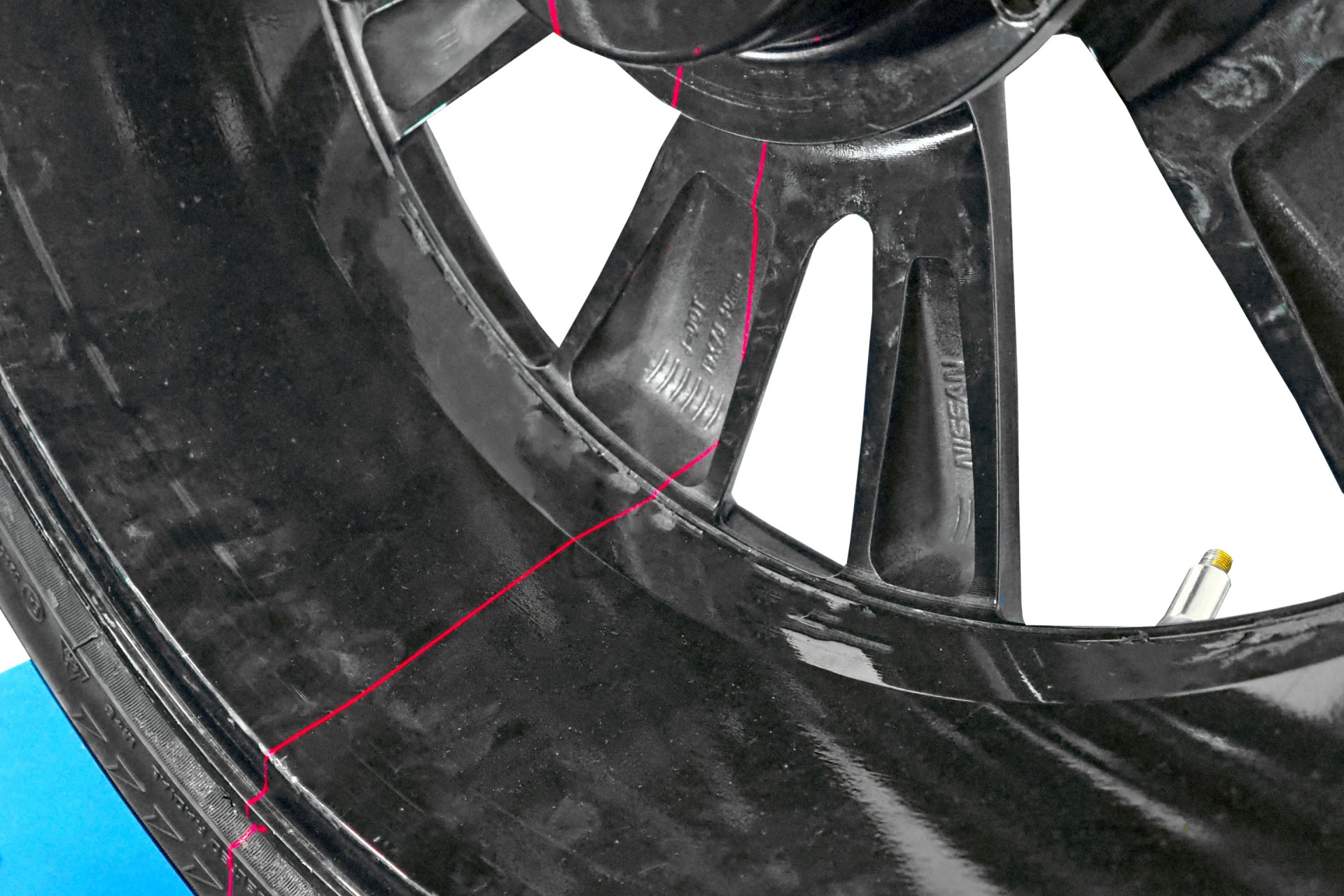 Zautomatyzowany odczyt parametrów 3D: ramię pomiarowe (odległość, średnica) oraz sonar badający szerokość felgi.